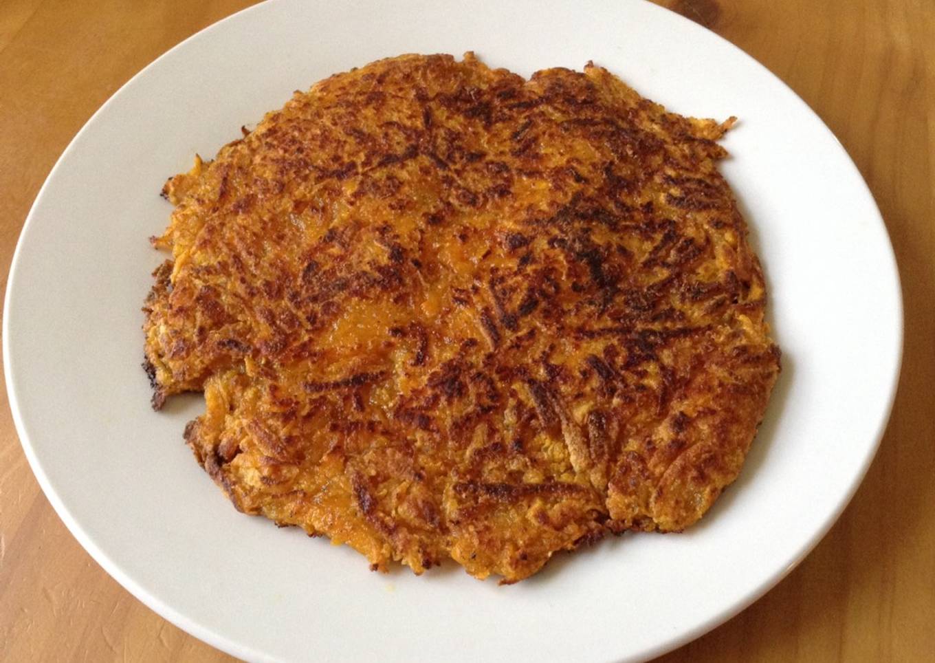 - En un sartán chico y con antiadherente poner una cucharada de aceite de coco a calentar y poner la batata rallada, formando una tortita, aplanando con la espátula.
