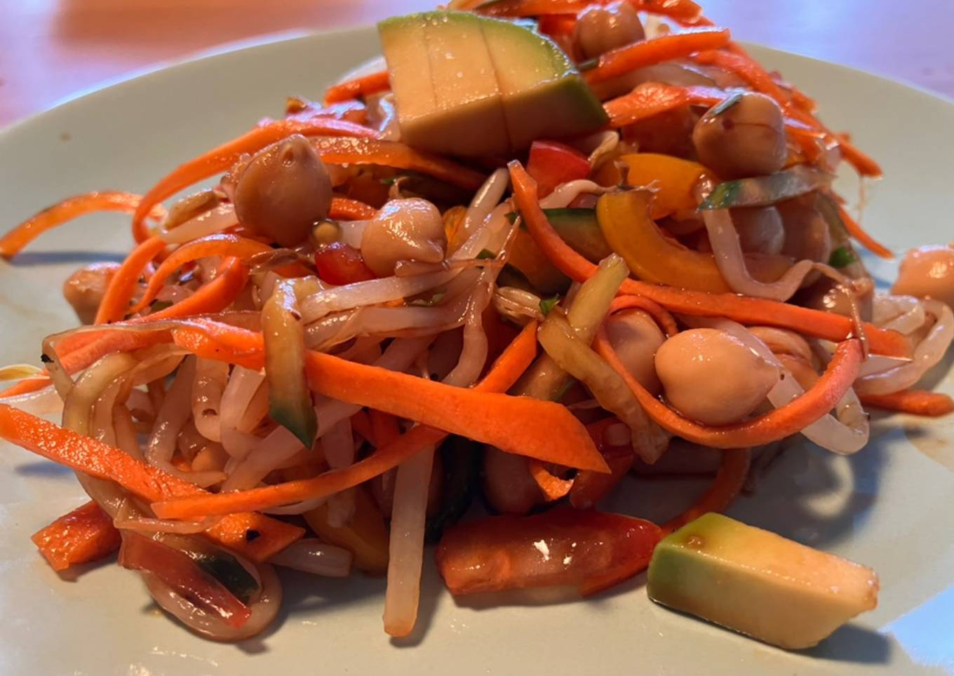 Ensalada de garbanzos, brotes de soja y aguacate estilo asiático