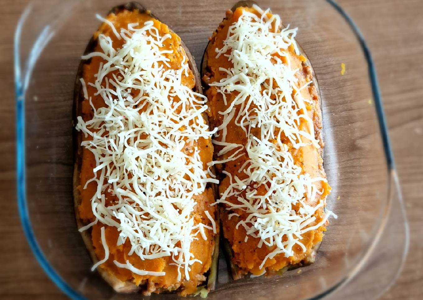 - Cubro las dos mitades con el puré de batata, le echo un poco de queso y al horno.