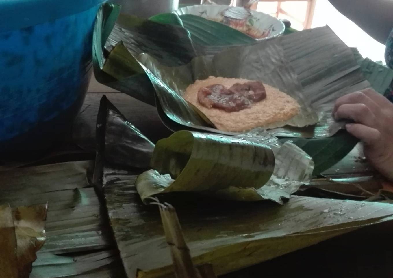 - Ahora como último paso es hacer los tamales, colocando abajo una hoja de bijao limpia y encima otra cocinada, luego una taza de la masa del tamal, puerco y encima un poco de salsa de tomate y amarrar uno por uno. Luego llevarlos a la olla y cocinarlos aproximadamente 1:30-2:00 horas. Te daras cuenta que esta listo en el momento que el bijao cambie un poco de color.
