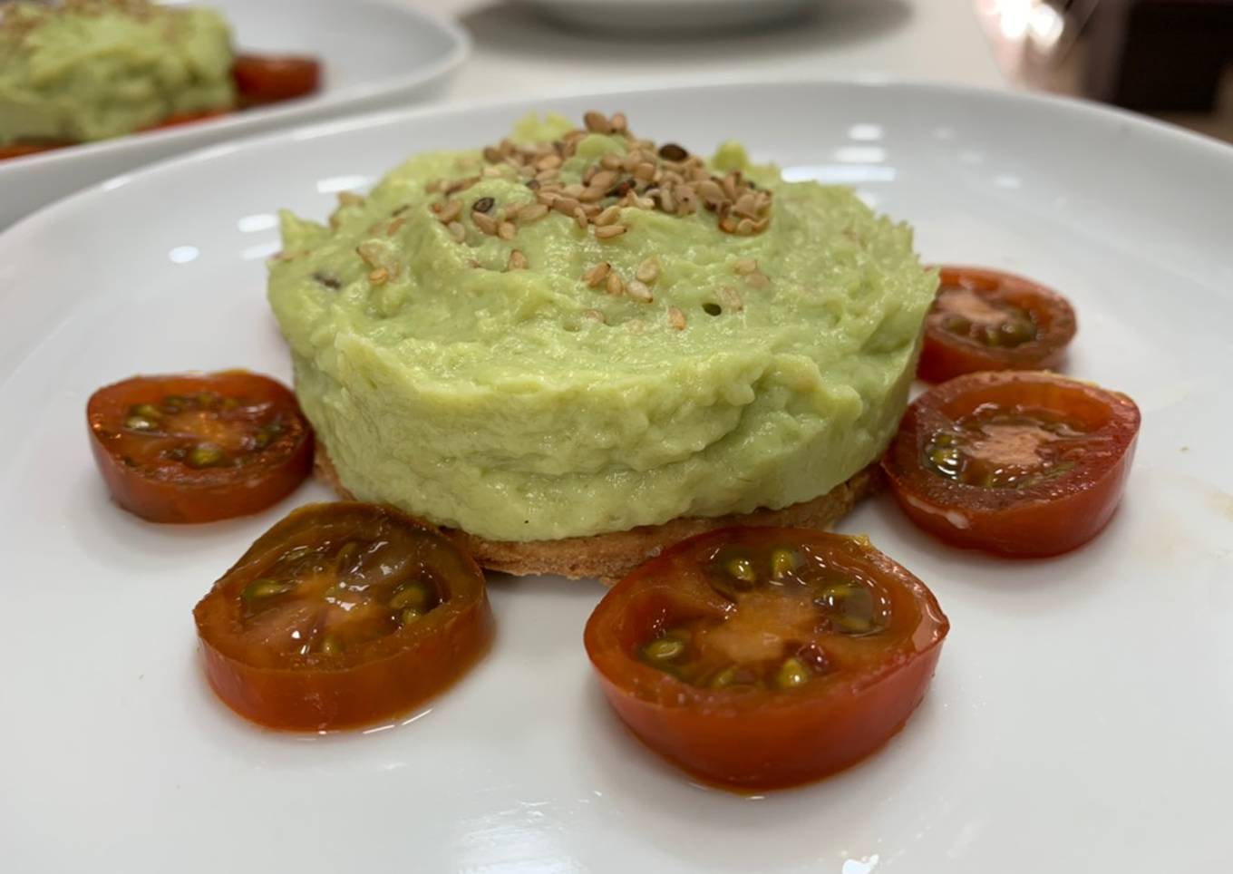 - Añadir la goma xantana a la mezcla de aguacate, remover bien y verás que enseguida empieza a espesar. Poner sobre la base en el aro metálico y meter en la nevera hasta justo antes de su consumo.