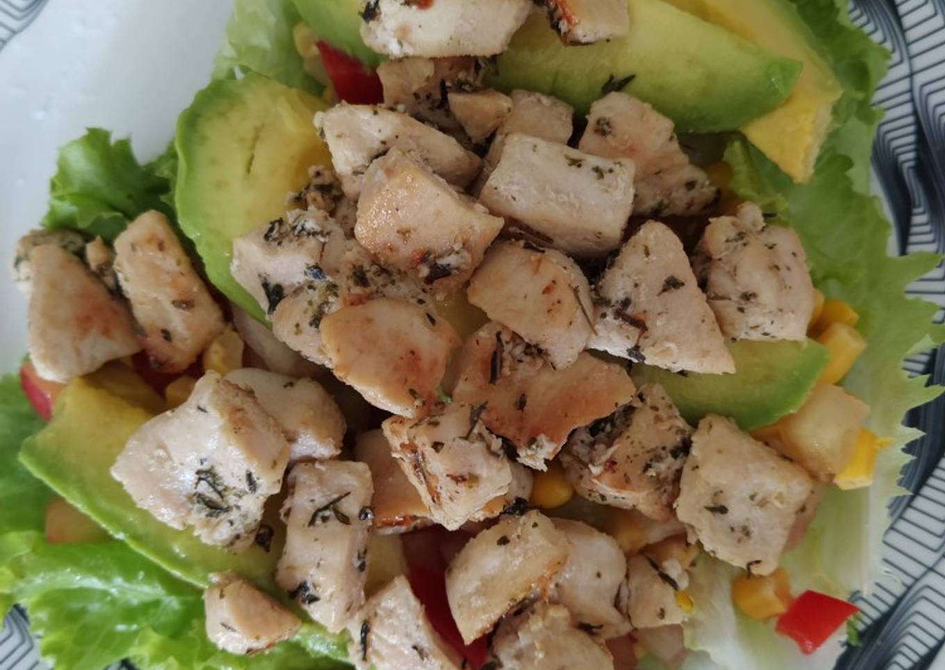 - Para servir, coloca las hojas de la lechuga en forma de una tortilla y añades el tomate, los maicitos, el aguacate y encima el pollo y le pueden añadir una vinagreta. Listo, disfruten !!!