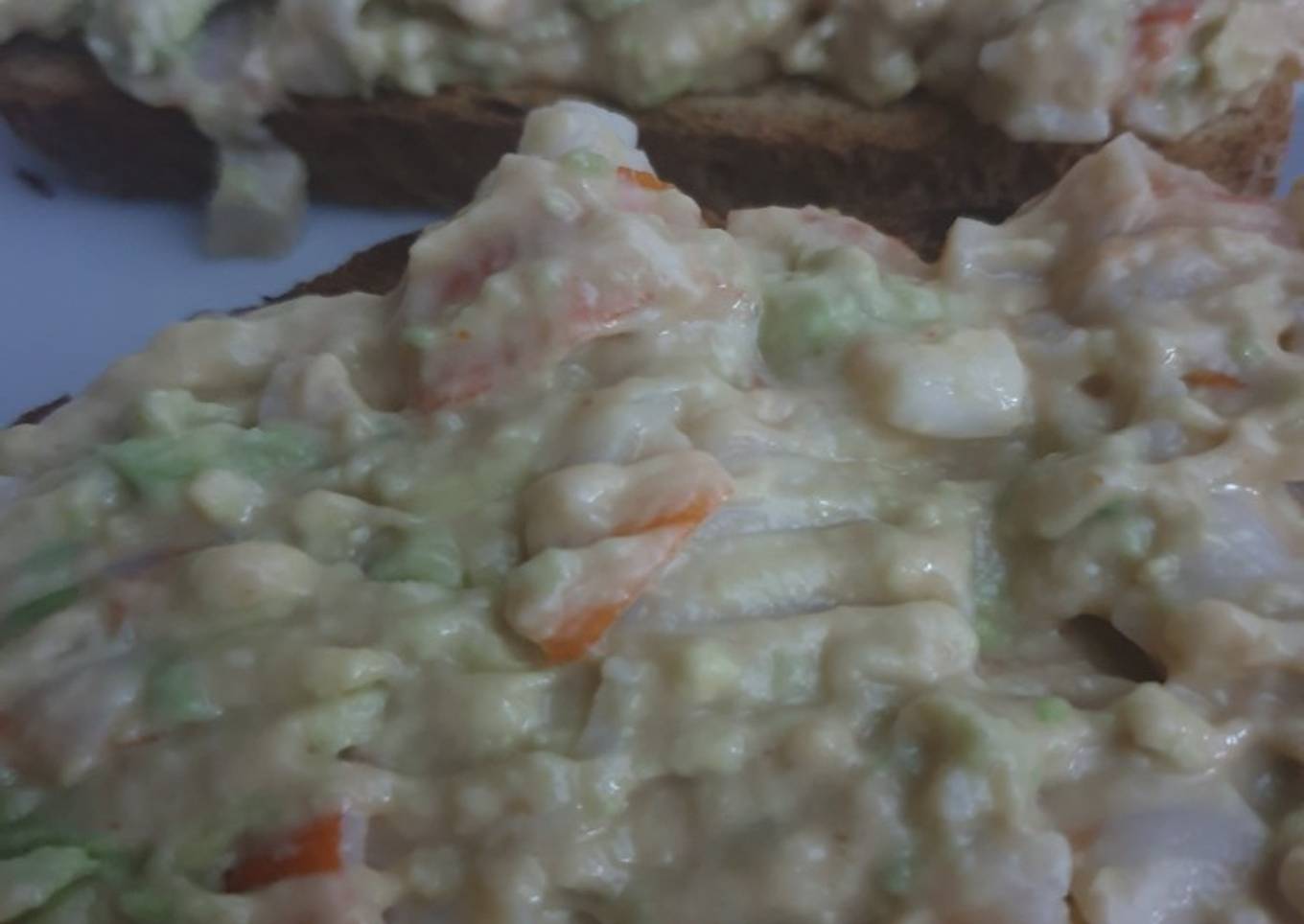 - Se hace una mezcla con el aguacate, el cangrejo, la cebolleta y las salsitas y las ponemos encima de la tostada