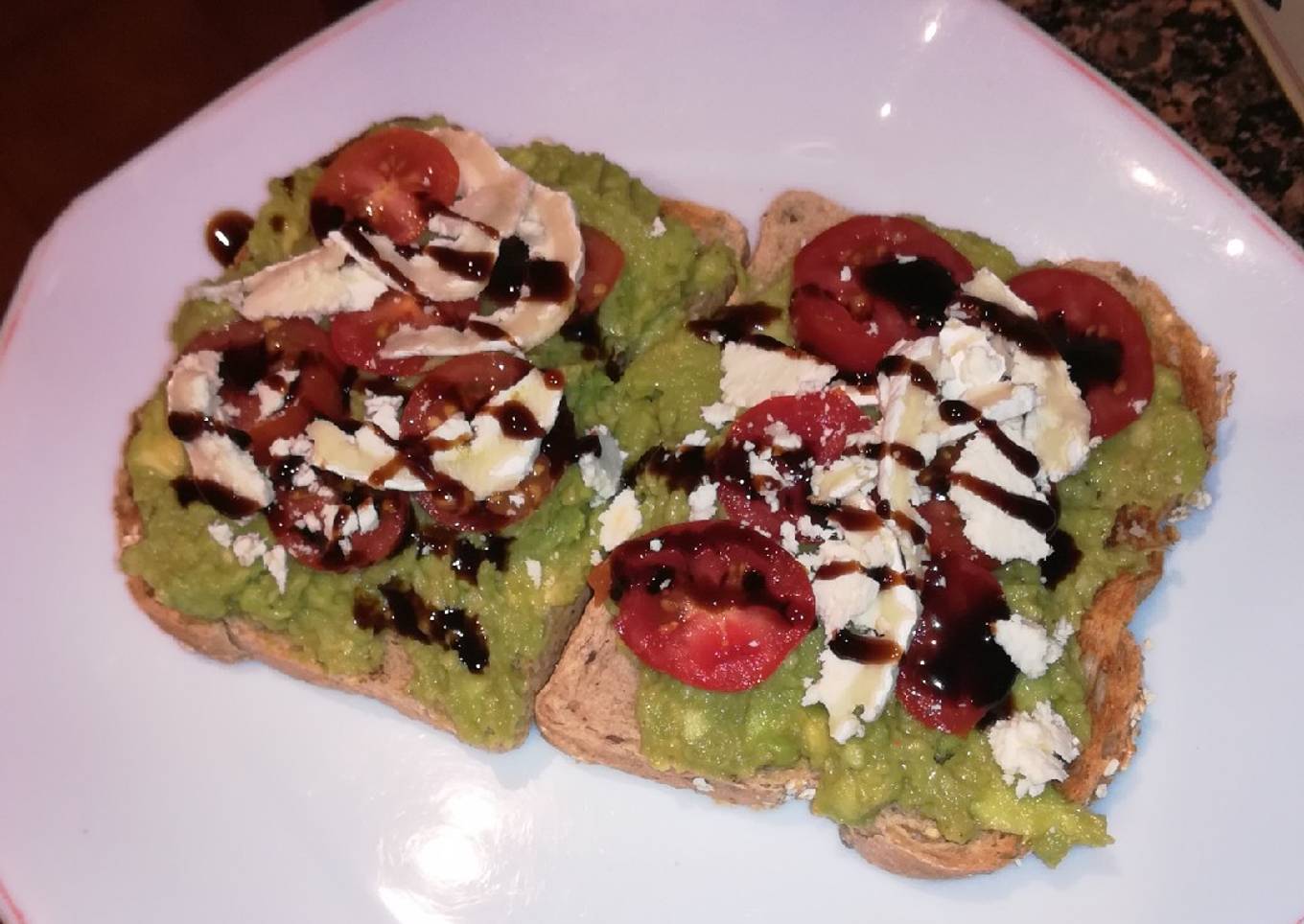 - Ponemos la mezcla del aguacate en la tostada con rodajas de tomate y queso de cabra por encima.