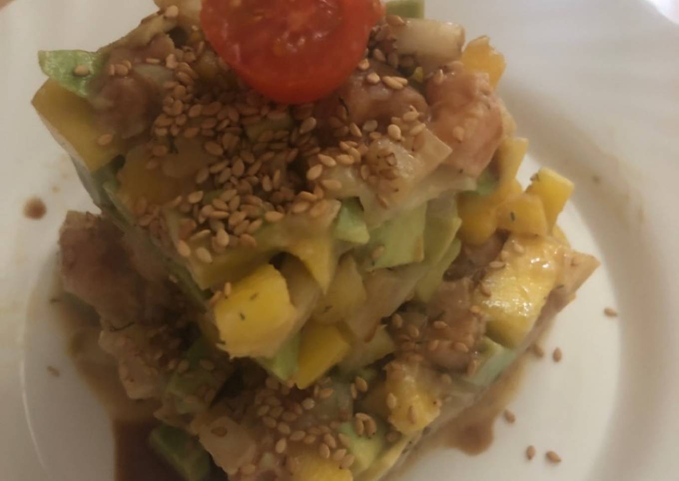 - Mientras pelamos y cortamos el aguacate y el mango en dados de 1 cm. Cuando ha pasado la hora, lo mezclamos con el marinado. Mezclamos. Servimos con el sésamo por encima. Que aproveche!!!