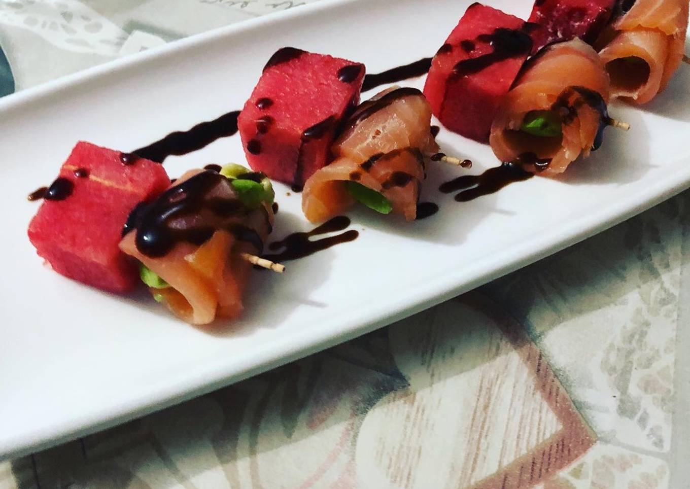 - Pinchamos el dado de sandía lo colocamos en el plato y adornamos con el balsámico de Módena y a disfrutar de una brocheta sabrosa