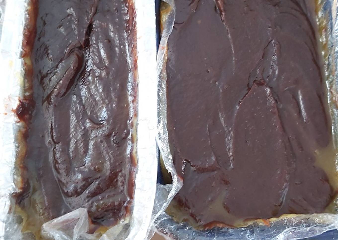 - Separamos una parte de la preparación en un bowl y agregamos el cacao y lo mezclamos bien. Luego vertemos en un molde con papel film la preparación sola y por encima la de chocolate e integramos de modo que nos queden las características betas del chocolate en el dulce.