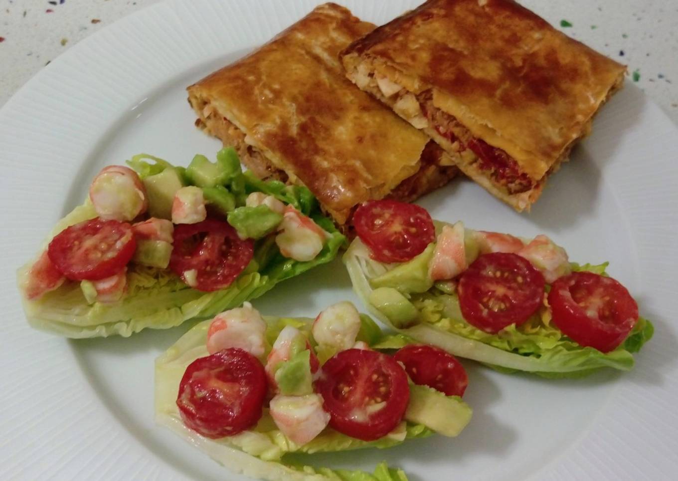 Empanada de atún y cogollos con langostinos y aguacate