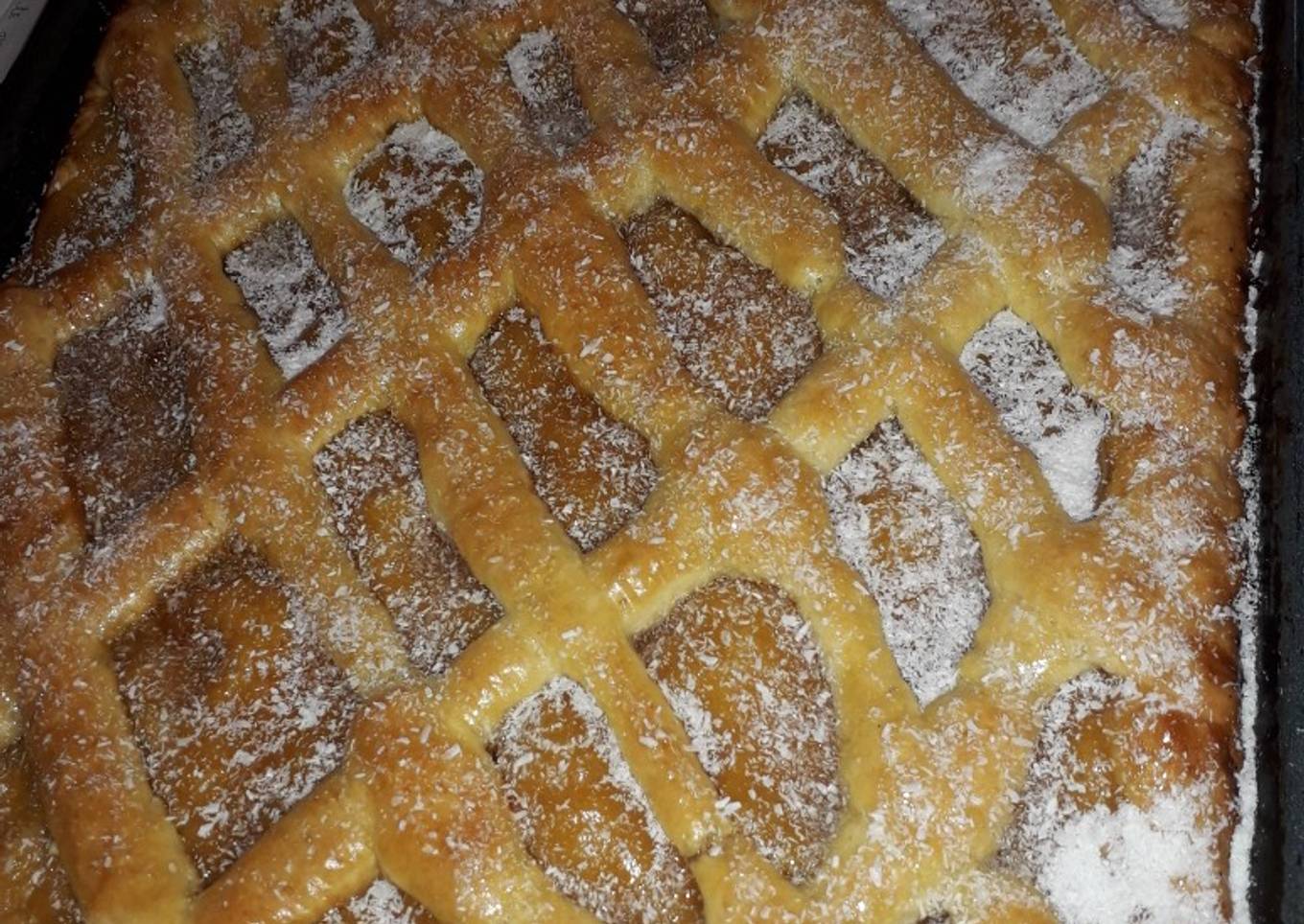 - Luego se pinta con un huevo batido y se cocina en horno suave. Se hace un almíbar con unas cucharadas de azúcar y un poquito de agua. Se pincela una que que está cocida la frola y se decora con coco rallado !!