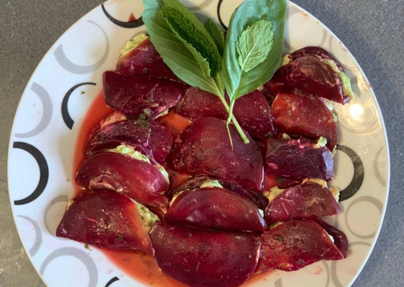 - Para el empatado, vamos seleccionando las rodajas de remolacha e incorporamos una o dos cucharadas pequeñas de postre del relleno. Finalmente, añadimos la salsa veraniega.