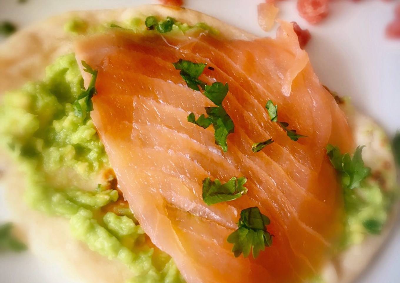 Steps to make to make Tortilla de harina y yogur griego con aguacate y salmón