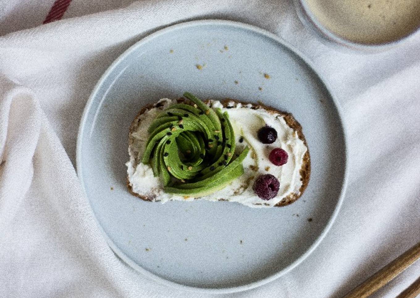 - Cortar el aguacate en finas láminas y colocar sobre la base. Podéis aprovechar para hacer una flor y así aún queda más rico 😜