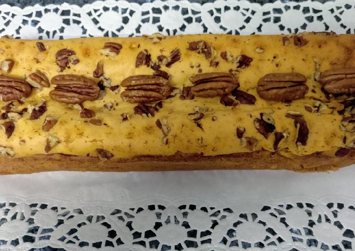 - Se vierte en un molde forrado con papel vegetal y se reparte por encima las nueces partidas.